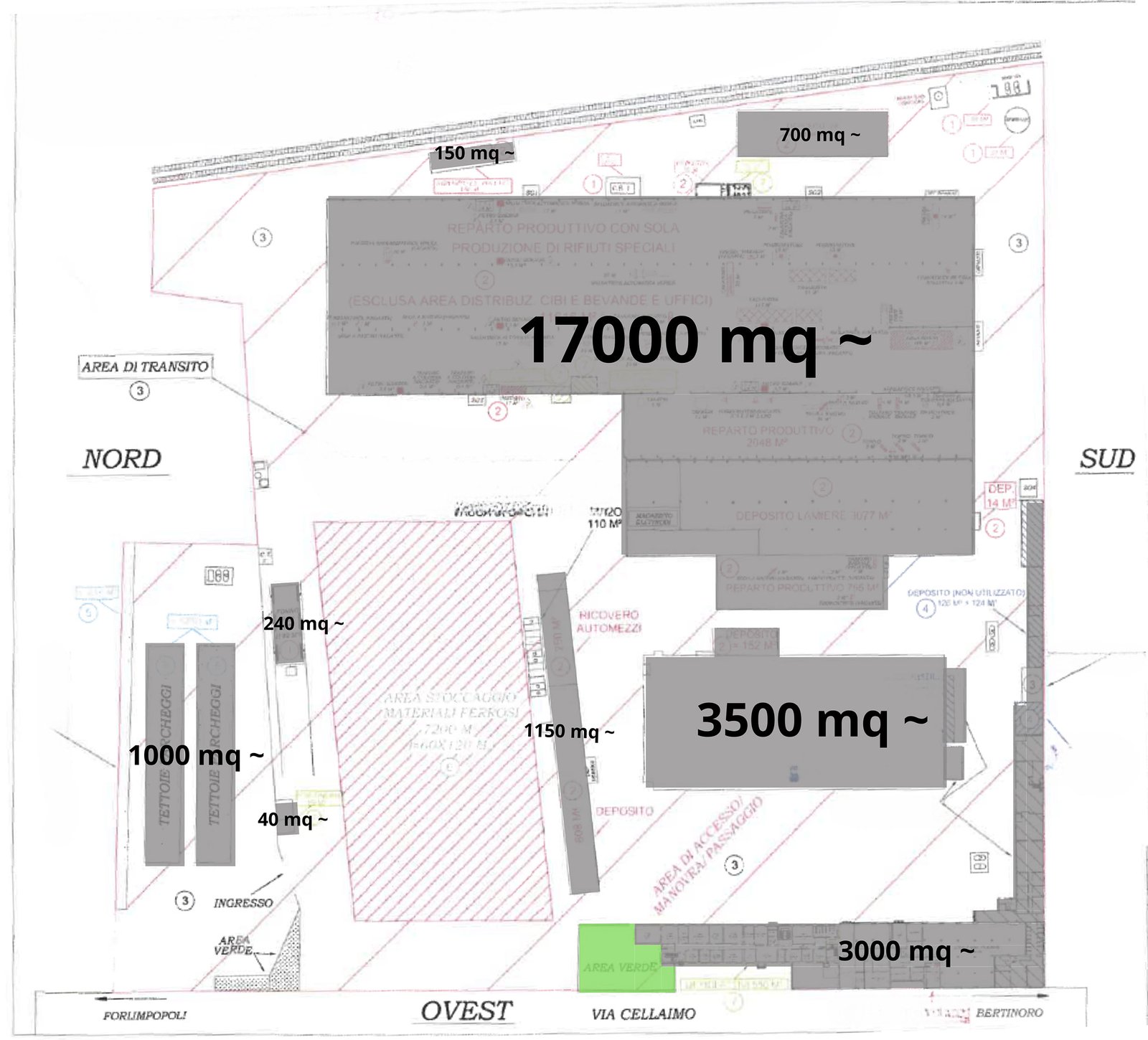 Il lotto comprende circa 70.000 mq complessivi, con capannoni industriali, magazzini, laboratori e uffici per una superficie coperta di circa 26.000 mq. La proprietà si estende tra i comuni di Bertinoro e Forlimpopoli, ed è già dotata di accesso carrabile e infrastrutture principali.